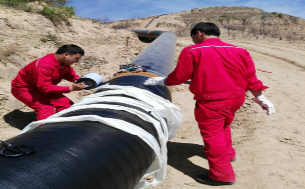 3、纏繞聚丙烯防腐膠帶待底漆表干后即可進(jìn)行,繞帶過程中必須保持均勻漲力,纏平貼實、搭接一致,纏好膠粘帶后,在埋地前為克服造成起泡現(xiàn)象,需將防腐管道采取遮陽保護(hù)的方法掩蓋24小時。