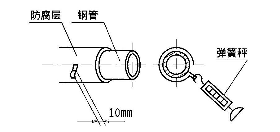 6.4.3 粘結(jié)力(剝離強(qiáng)度):這一指標(biāo)直接關(guān)系到防腐層的質(zhì)量,水的滲透能力與膠帶和鋼材之間的粘結(jié)力有關(guān),所以應(yīng)確保膠帶對鋼材具有足夠的粘結(jié)力。依據(jù)我國標(biāo)準(zhǔn)SY/T 0414-2007中的說明,邁強(qiáng)牌熱塑丁基橡膠改性瀝青類防腐膠帶可定稱為專用防腐帶(膠層厚、粘結(jié)力大、帶有防粘膜、可粘結(jié)聚乙烯等材料、能確保質(zhì)量的防腐膠帶)。按我國SY/T 0414-2007標(biāo)準(zhǔn),剝離強(qiáng)調(diào)的測量是采用下列方法進(jìn)行的;用刀沿環(huán)向劃開10㎜寬、長度大于100㎜的膠帶層,直至管體。然后用彈簧秤與管壁成90度角拉開,拉開速度不大于300㎜/min,剝離強(qiáng)度應(yīng)大于18N/㎝,該測試應(yīng)在纏好膠帶24小時后進(jìn)行。如下圖所示: