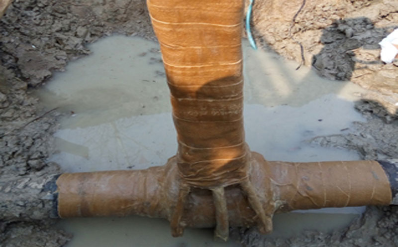 3、通常以最小搭接寬度25mm螺旋繞纏礦脂帶,延續(xù)帶長時鏈接重疊不部位應(yīng)小于100mm。對于嚴(yán)重和特殊的腐蝕環(huán)境,建議搭接帶寬的55%重疊繞纏礦脂帶。