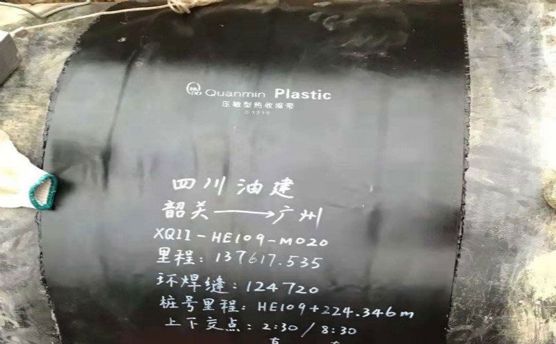 3、沿管徑環(huán)繞熱縮壓敏帶后,先將固定片通過加熱,粘接在適應(yīng)的壓敏膠熱收縮帶接頭部位,形成筒狀。隨后移離需作業(yè)段,用火焰沿周向均勻加熱,達到收縮。隨之再沿徑向分別向兩側(cè)加熱,受熱力作用收縮,內(nèi)層熱膠同時熔化包覆填充于作業(yè)表面,與管道防腐層形成緊密連續(xù)的防腐蝕保護體系。